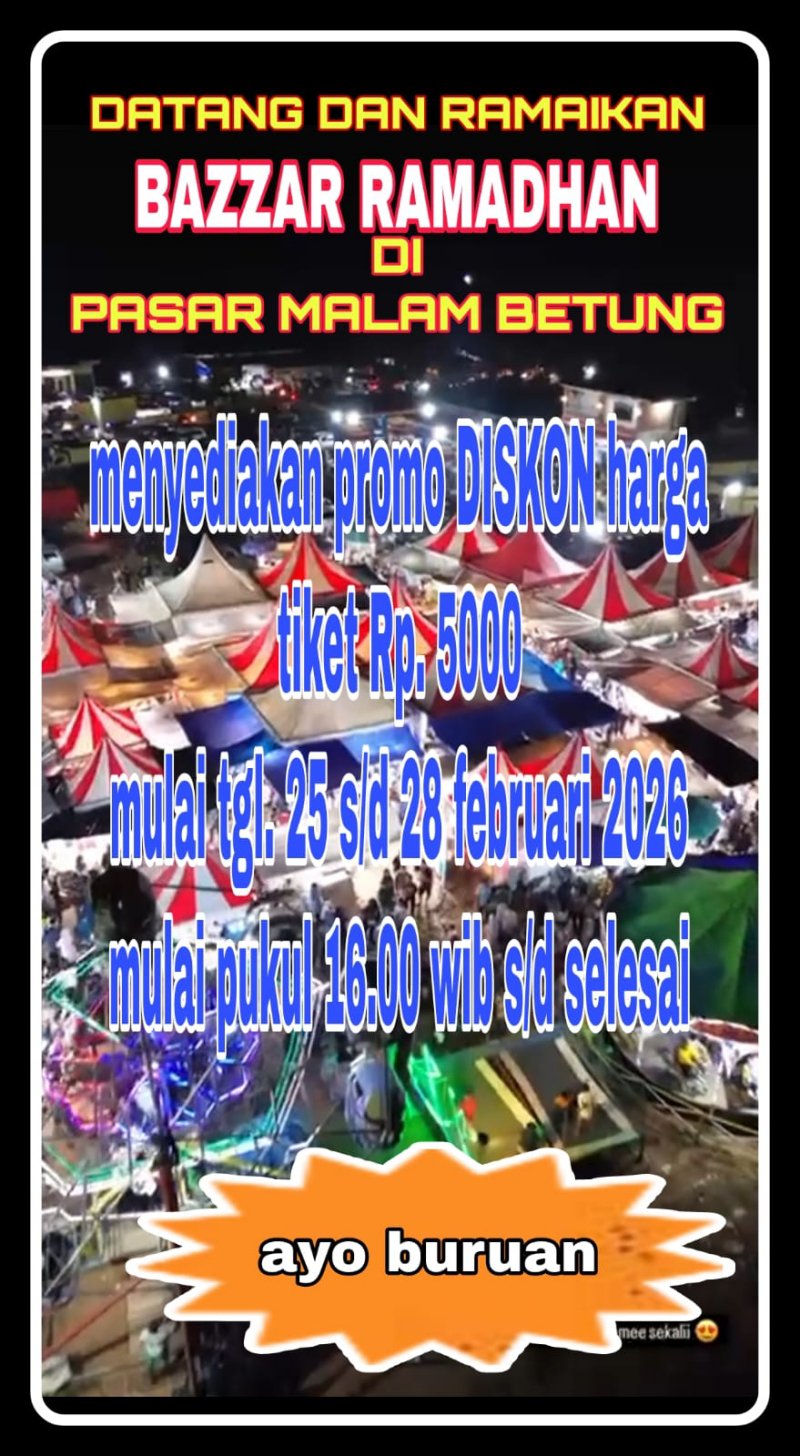 BETUNG, LS – Kabar gembira bagi warga Kecamatan Betung dan sekitarnya. Wahana hiburan keluarga “Doa Ibu” menggelar Bazar Ramadhan Pasar Malam Betung yang berlokasi di Jalan Betung-Sekayu, tepatnya di Lapangan Sepak Bola Perjuangan, Kelurahan Betung, Kecamatan Betung Kabupaten Banyuasin, resmi menggelar promo spesial.