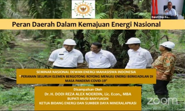 Kali ini Bupati Dr H Dodi Reza Alex Noerdin Lic Econ MBA sebagai Ketua Bidang Energi Dan Sumber Daya Mineral (SDM) Asosiasi Pemerintah Kabupaten Seluruh Indonesia (APKASI), didapuk narasumber Seminar Nasional, “Peranan Seluruh Elemen Bergotong Royong Menuju Energi Berkeadilan di Masa Pandemi COVID-19” yang dilaksanakan secaravirtual, (2/8/2021).