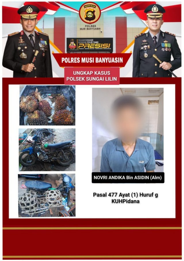Dalam penindakan tersebut, pihak Polsek sungai lilin turut mengamankan barang bukti berupa 6 buah tandan kelapa sawit dengan berat bruto 160 kg, 1 unit sepeda motor Yamaha Vega R warna biru tanpa body, tanpa plat dan tanpa no rangka dan no mesin, 1 buah keranjang yang terbuat dari anyaman rotan. (MC)
