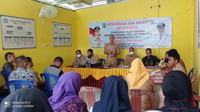 MUBA, Liputansumatera.com – Desa Purwosari Kecamatan Lais Kabupaten Musi Banyuasin menyelenggarakan Musyawarah Desa Khusus (Musdessus) dalam rangka pembahasan calon penerima Bantuan Langsung Tunai (BLT) Dana Desa Tahun Anggaran 2022.
