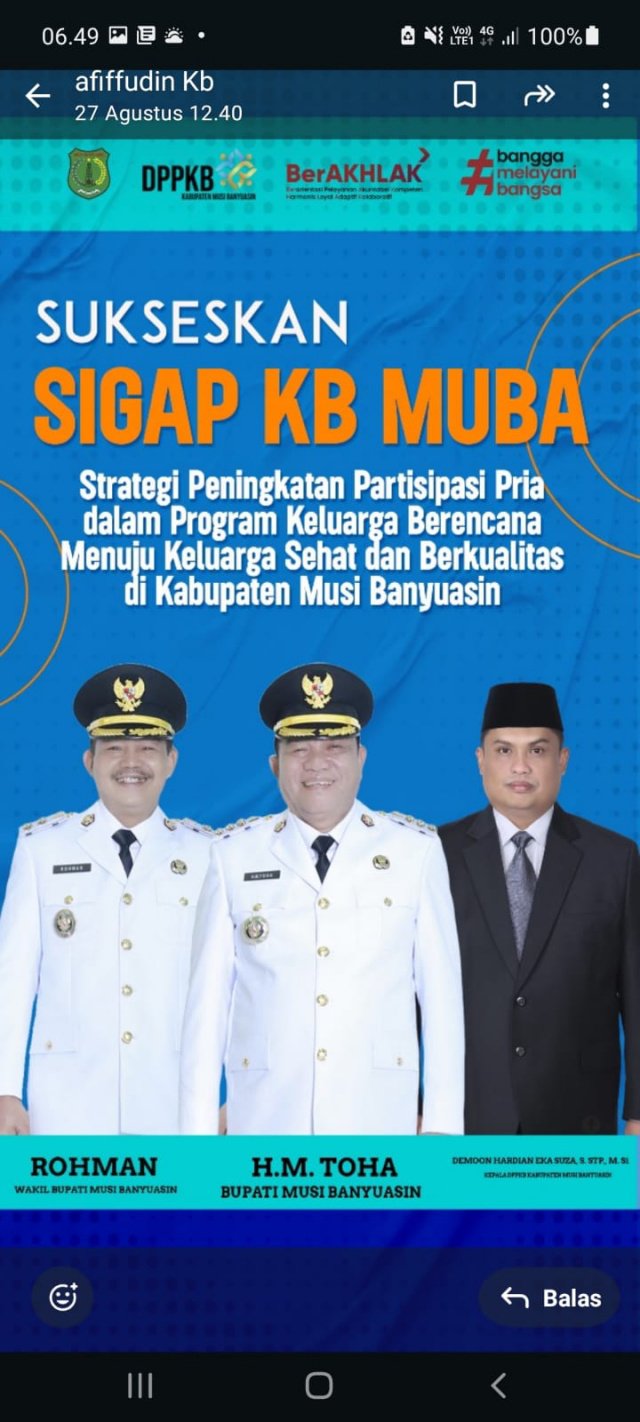 Menurutnya, keberhasilan program KB tidak bisa hanya dibebankan pada perempuan. “Melalui SIGAP KB Muba, kita ingin mengubah persepsi bahwa KB adalah tanggung jawab bersama, termasuk peran aktif pria dalam perencanaan keluarga. Ini juga bagian dari upaya kita mempercepat penurunan stunting dan meningkatkan kualitas SDM Musi Banyuasin,” tegasnya.