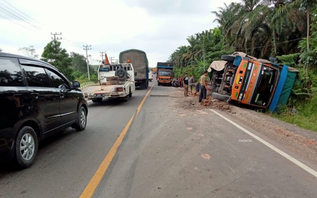 Fuso penuh muatan bahan kelontong dari Jakarta tujuan Medan ini terbalik lantaran mencoba menghindari galian jalan proyek tambal sulam di lokasi tersebut.