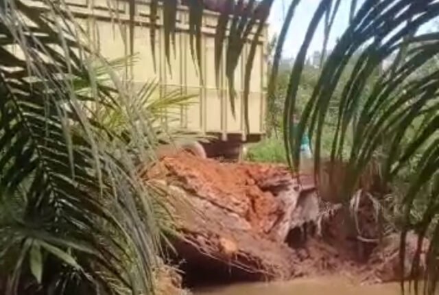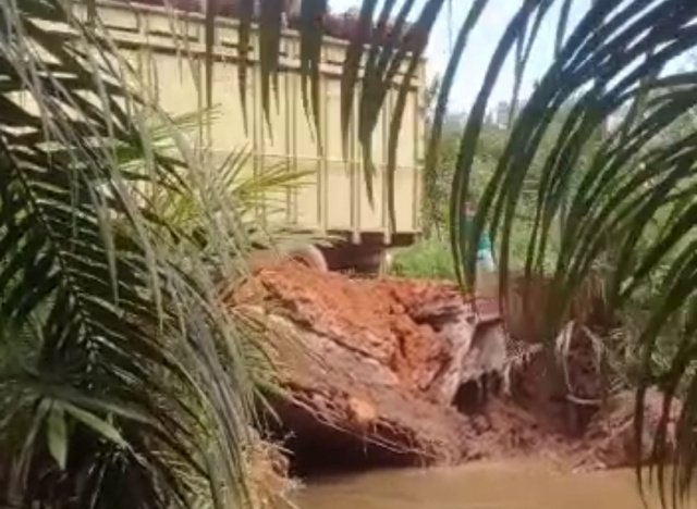 Akibatnya, salah satu truk muatan tandan buah sawit yang saat itu melintas dan bertepatan di tengah-tengah jembatan, terperosok akibat ban sebelah belakang ikut amblas.