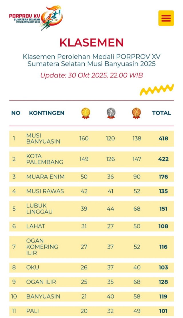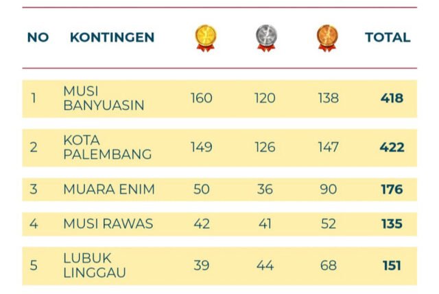 Dalam daftar klasemen perolehan medali sementara sampai malam ini, Kamis (30/10/25) Pk 22.00 Wib, Kontingen Musi Rawas berhasil menyalip Lubuklinggau diposisi 4 besar dengan 42 medali Emas, 41 Perak dan 52 Perunggu.