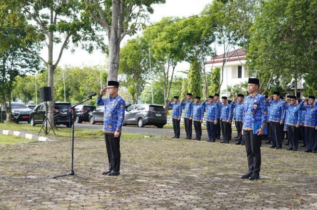 BANYUASIN, LS – Pj Bupati Banyuasin H Hani Syopiar Rustam SH memimpin apel gabungan Pemkab Banyuasin pasca libur dan cuti bersama hari raya IdulFitri 1145 Hijriah / 2024 Masehi, di Lapangan Upacara Kantor Bupati Banyuasin, Rabu (17/4/2024).