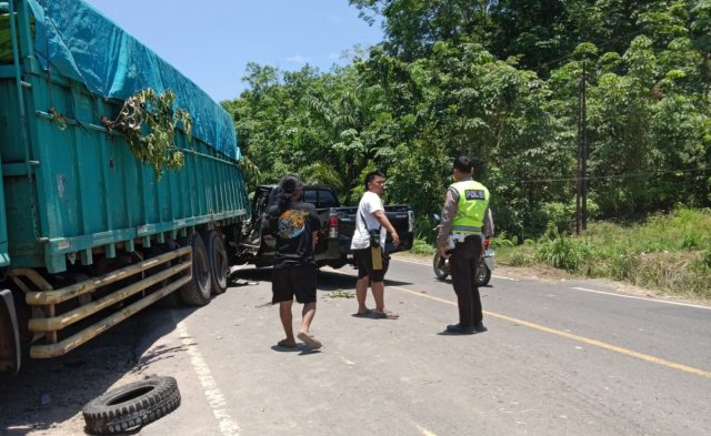 Kecelakaan melibatkan kendaraan Toyota Hilux dengan nomor polisi BK 8467 FG dan Tronton Hino dengan nomor polisi BE 8393 AMF.