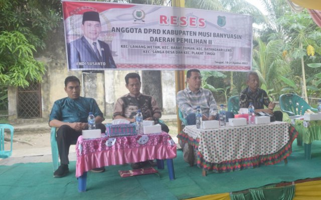 MUBA, Liputansumatera.com – Guna menyerap aspirasi masyarakat khususnya di Daerah Pemilihan, Wakil Ketua III DPRD Kabupaten Musi Banyuasin (Muba) Endi Susanto SE, melakukan reses di Desa Rantau Panjang Kecamatan Lawang Wetan,